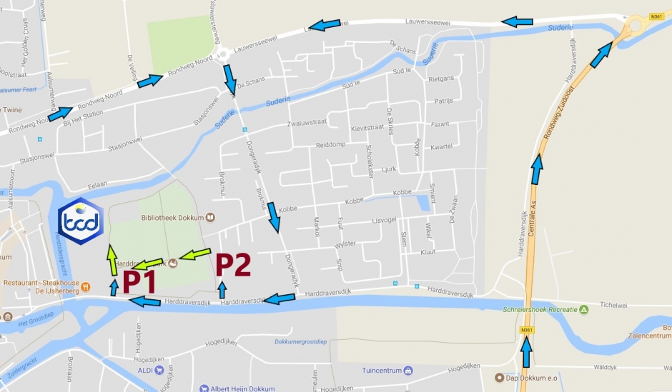 U blijft rechtdoor rijden op de Harddraversdijk tot u de sportvelden rechts ziet. Vlak voor de vernauwing in de weg slaat u rechtsaf en rijdt u parkeerplaats P1 op (betaald parkeren).